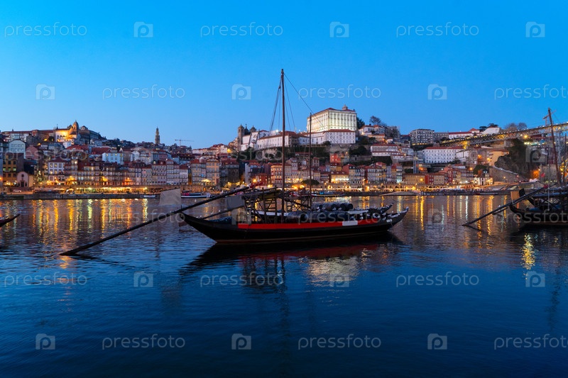 Живописный, красочный вид на старый город Порту на закате над рекой Дору. Порту, туристический средиземноморский город