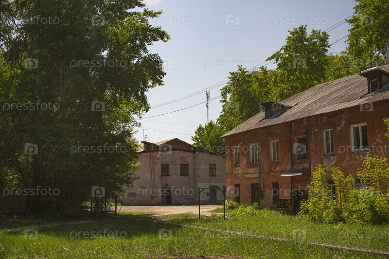 Городской пейзаж. Старый городской двор с домами похожи на застройки, сияющие летним днем. Ленинский район города Челябинска в районе Сельмаша