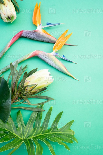 Тропические листья и цветы на зеленом фоне, летний фон с местом для копирования