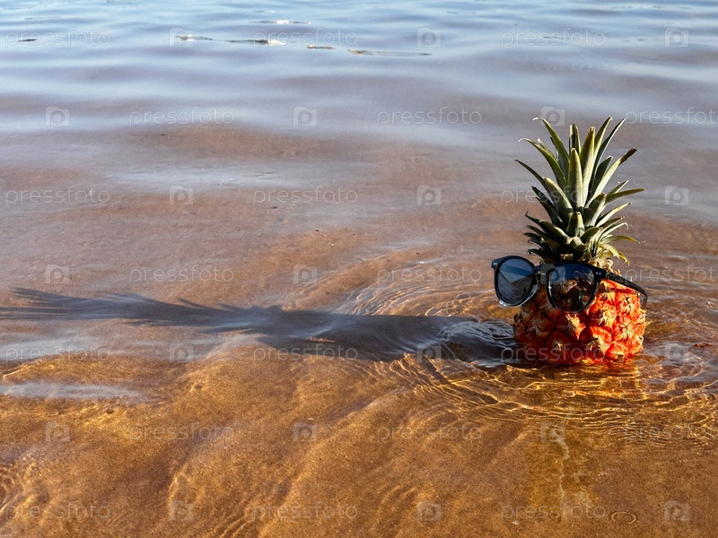 Ананас на пляже в солнцезащитных очках и наушниках