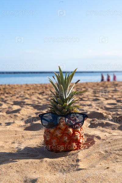 Ананас на пляже в солнцезащитных очках и наушниках