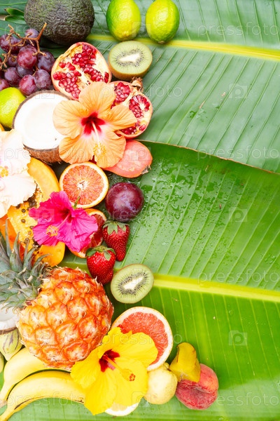 Летний микс тропических фруктов на зеленом листе с местом для текста