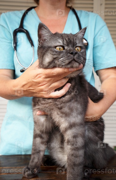 Женщина-ветеринар держит больного кота крупным планом. Диагностика здоровья домашних животных в концепции ветеринарной клиники