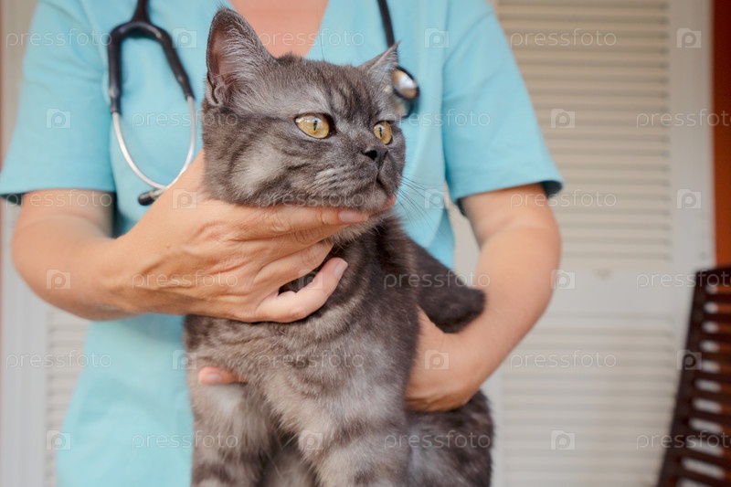 Женщина-ветеринар держит больного кота крупным планом. Диагностика здоровья домашних животных в концепции ветеринарной клиники