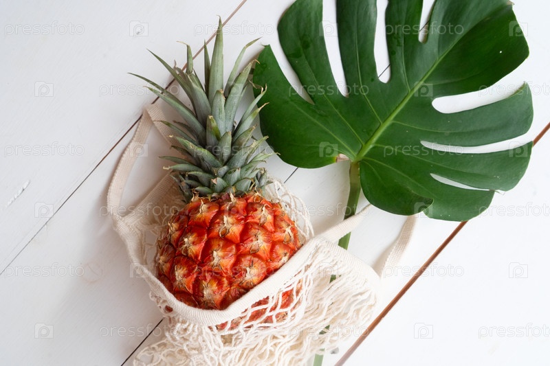 Ананас на белом деревянном столе в сумке
