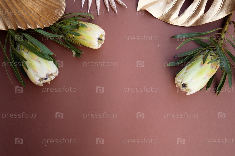 Тропические листья и цветы на коричневом фоне, летний фон с местом для копирования