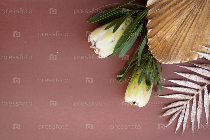 Тропические листья и цветы на коричневом фоне, летний фон с местом для копирования