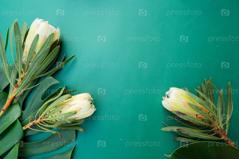 Тропические листья и цветы на зеленом фоне, летний фон, вид сверху