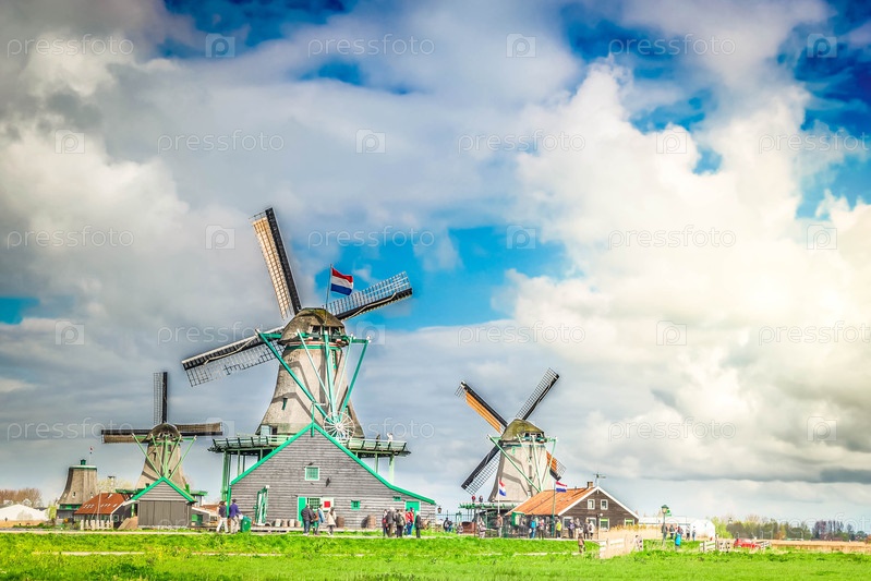 Сельский голландский пейзаж с традиционными ветряными мельницами небольшого старого города Заансе-Сханс на закате, Нидерланды