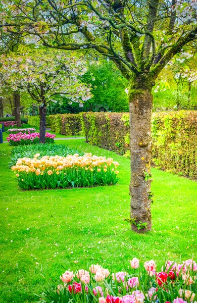 Красочные растущие и цветущие тюльпаны на клумбе в весеннем формальном саду