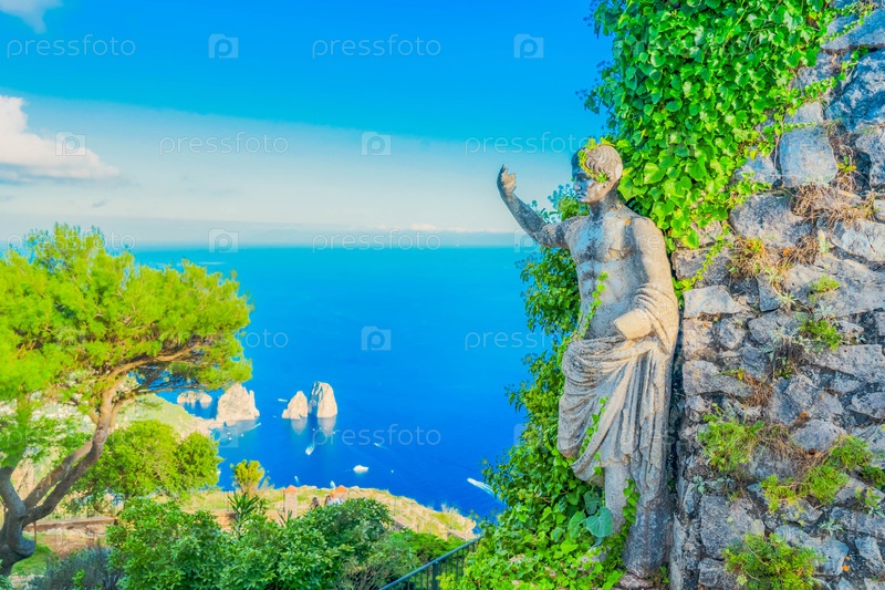 Красивая летняя роскошная природа и архитектура острова Капри, Италия, в ретро-тонах