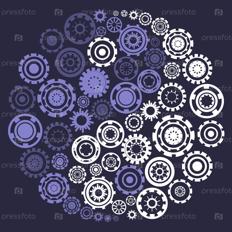 Поздравительная открытка с белыми снежинками разной формы, похожими на шестеренки
