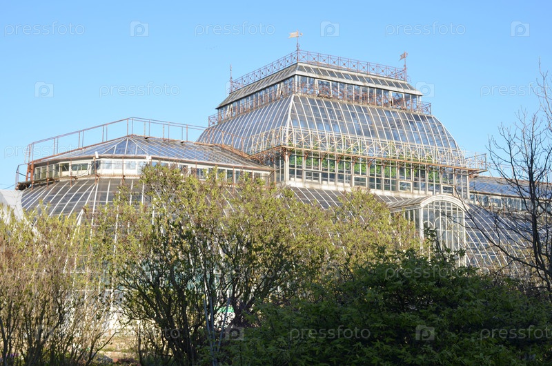 Здание оранжереи и внутренний дворик Ботанического сада Петра Великого в Санкт-Петербурге весной