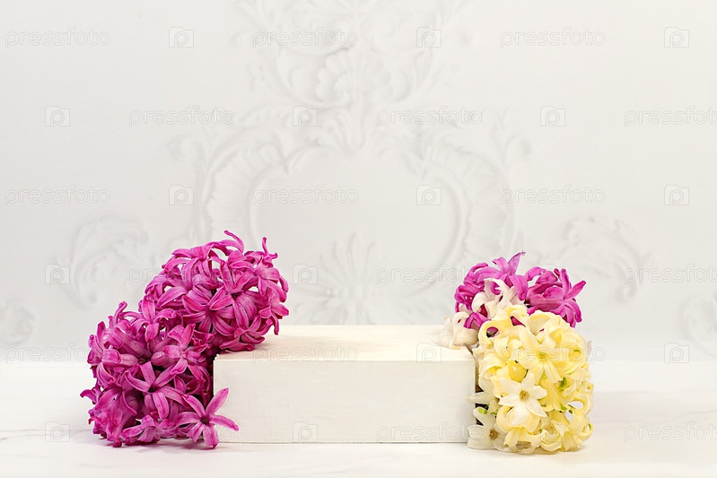 Пустой подиум продукта и свежие живые гиацинты, абстрактная красивая цветочная композиция. Сцена для бизнес-концепции. Минимальная современная эстетическая и элегантная концепция красоты, цветочный баннер