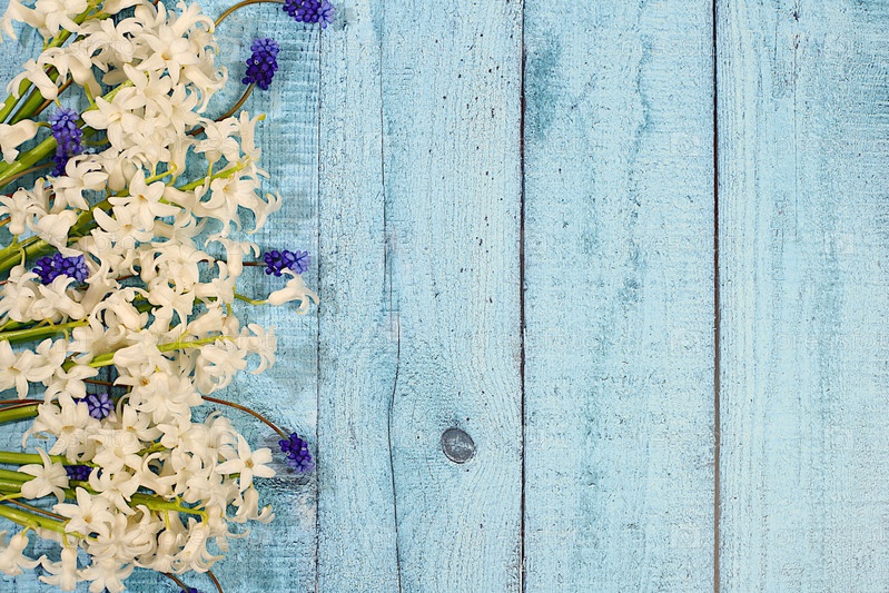 Абстрактная цветочная композиция для экрана и шаблона дизайна. Красивый баннер с белыми гиацинтами и синими мускари. Весенняя открытка, элегантная концепция естественной красоты, подарок для любимых