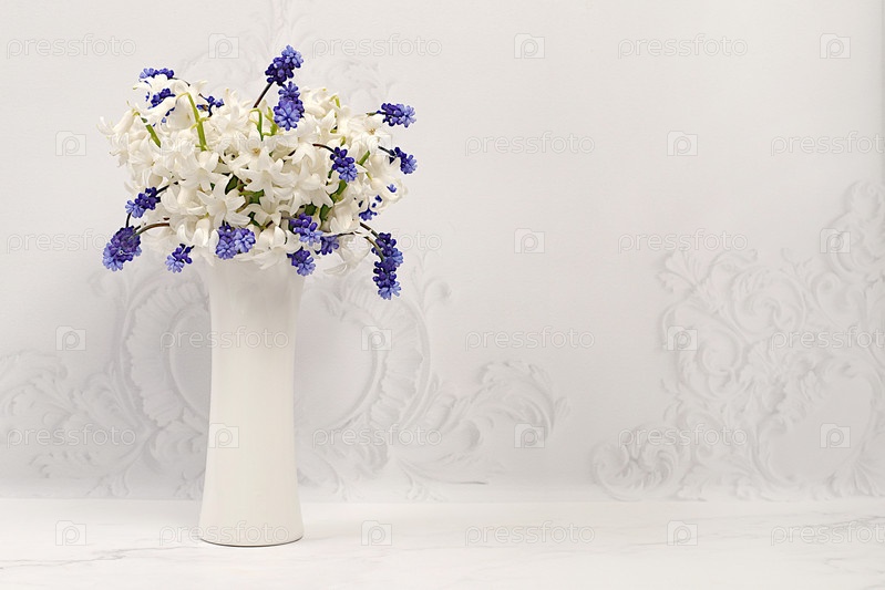 Красивый натюрморт с белыми гиацинтами и синими мускари в вазе на элегантном современном фоне, абстрактная цветочная композиция, шаблон для дизайна и баннер для экрана. Весенняя открытка, подарок для любимых