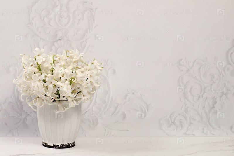 Абстрактная цветочная композиция. Красивый баннер с белоснежными гиацинтами и синими мускари в вазе на элегантном современном фоне, шаблон для дизайна и экрана. Весенняя открытка, подарок для любимых