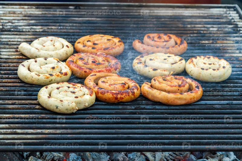 Жареные сосиски на гриле, крупный план фото
