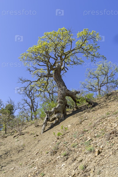 Дуб на ходульных корнях. Крым, окрестности курортного поселка Новый Свет. Апрель