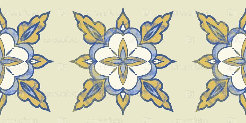 Узор азулежу, плитка, португальский дизайн. Расписанная вручную акварелью синяя фаянсовая посуда с цветочными арабесками. Подходит для печати на ткани, домашнем декоре, обоях и канцелярских товарах. Цветочная мозаика