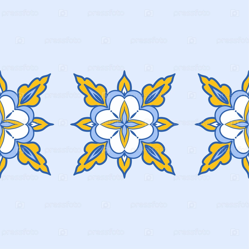 Узор азулежу, плитка, португальский дизайн. Расписанная вручную акварелью синяя фаянсовая посуда с цветочными арабесками. Подходит для печати на ткани, домашнем декоре, обоях и канцелярских товарах. Цветочная мозаика