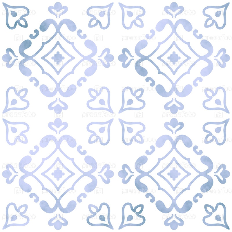 Узор азулежу, плитка, португальский дизайн. Расписанная вручную акварелью синяя фаянсовая посуда с цветочными арабесками. Подходит для печати на ткани, домашнем декоре, обоях и канцелярских товарах. Цветочная мозаика
