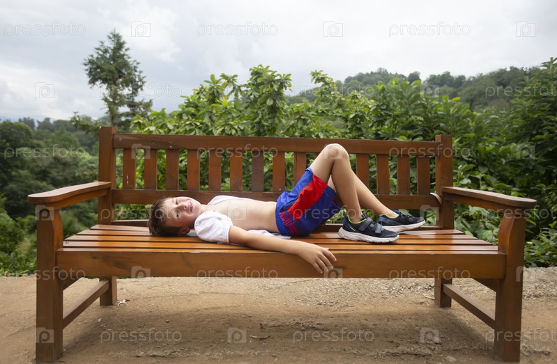 Счастливый ребенок в летнюю жару лежит на деревянной скамейке на фоне тропических растений. Мальчик на каникулах летом