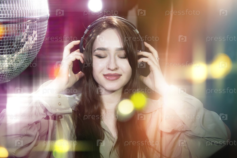 Красивая модная девушка в наушниках наслаждается прослушиванием классной музыки на фоне боке от диско-шара