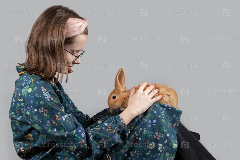 Красивая маленькая девочка в очках играет с красным кроликом на сером фоне