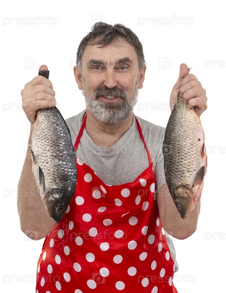 Зрелый торговец рыбой в красном фартуке держит большую пресноводную рыбу и смотрит в камеру на белом фоне