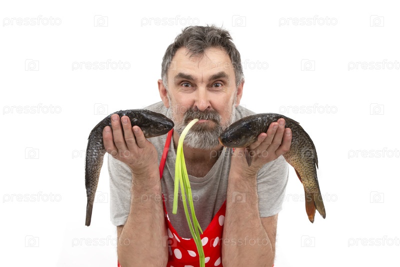Смешной бородатый торговец рыбой в красном фартуке держит большую пресноводную рыбу и смотрит в камеру на белом фоне