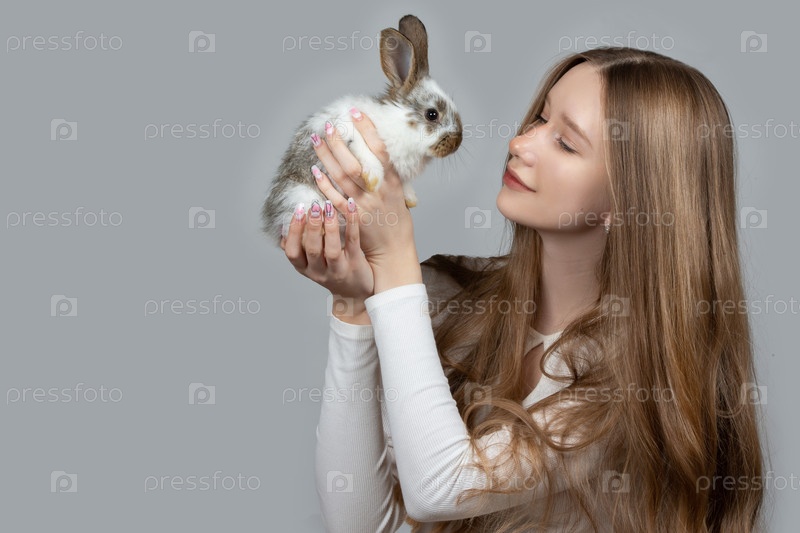 Счастливая молодая девушка держит белого кролика на сером фоне