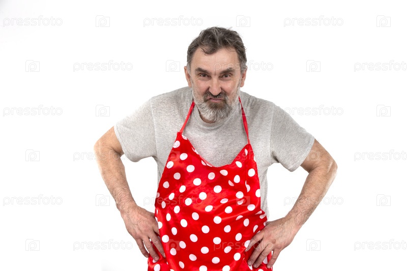 Пожилой бородатый мужчина в красном кулинарном фартуке в горошек на белом фоне