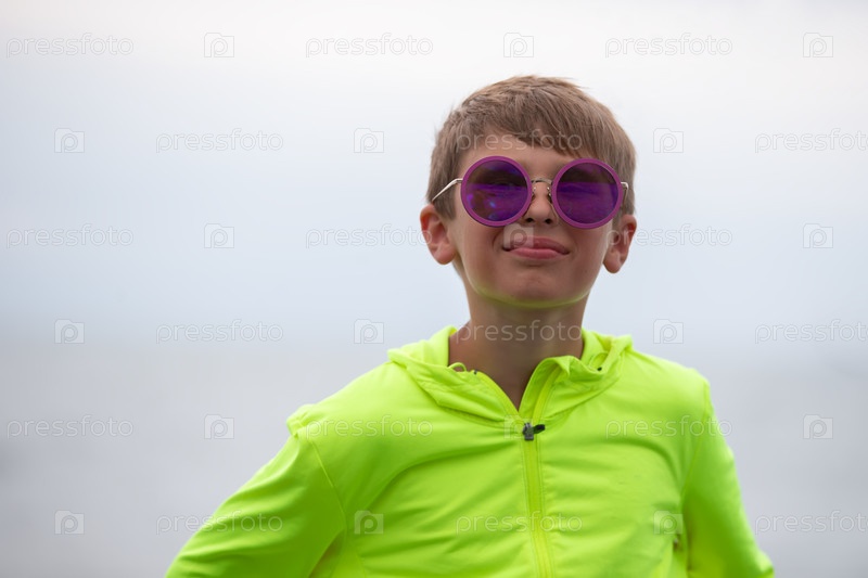 Красивый мальчик в ярко-зеленом свитере и фиолетовых солнцезащитных очках. Портрет счастливого десятилетнего мальчика