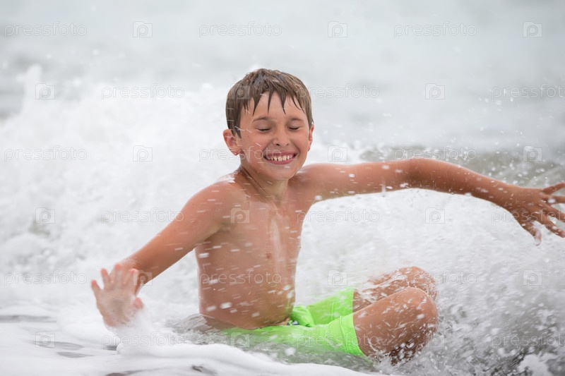 Счастливый мальчик играет с морской волной, наслаждаясь морем. Ребенок купается, загорает и отдыхает. Летние каникулы