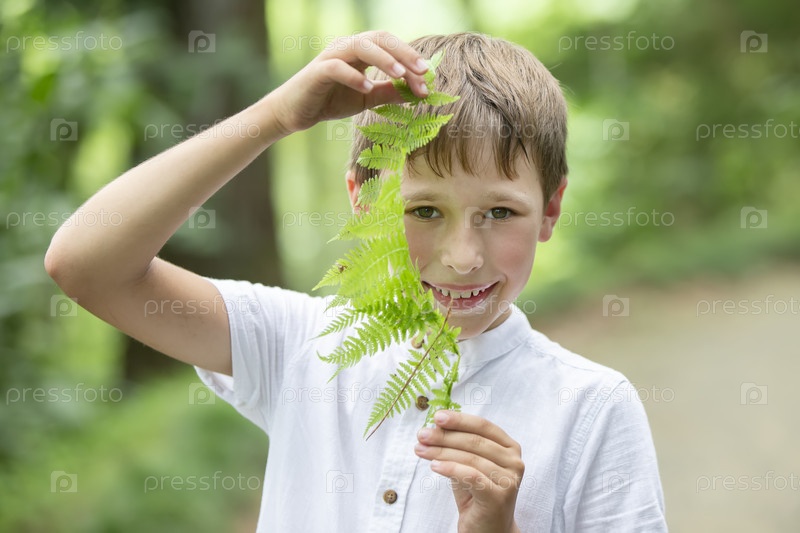 Красивый мальчик показывает лист папоротника. Ребенок с растением