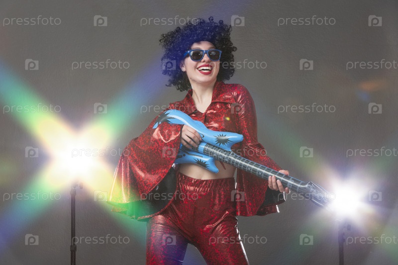 Жизнерадостная женщина в красном сценическом костюме в стиле диско держит в руках комическую гитару