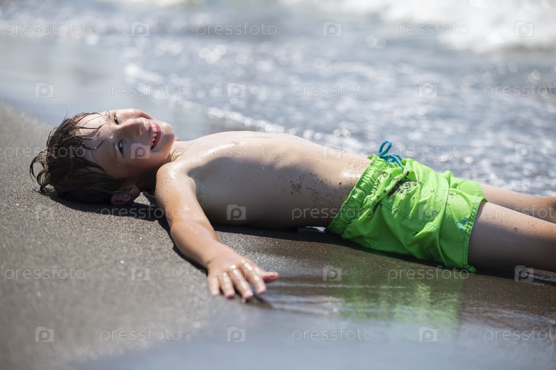 Счастливый мальчик отдыхает у моря, наслаждаясь волнами и летними каникулами. Ребенок на каникулах на берегу моря