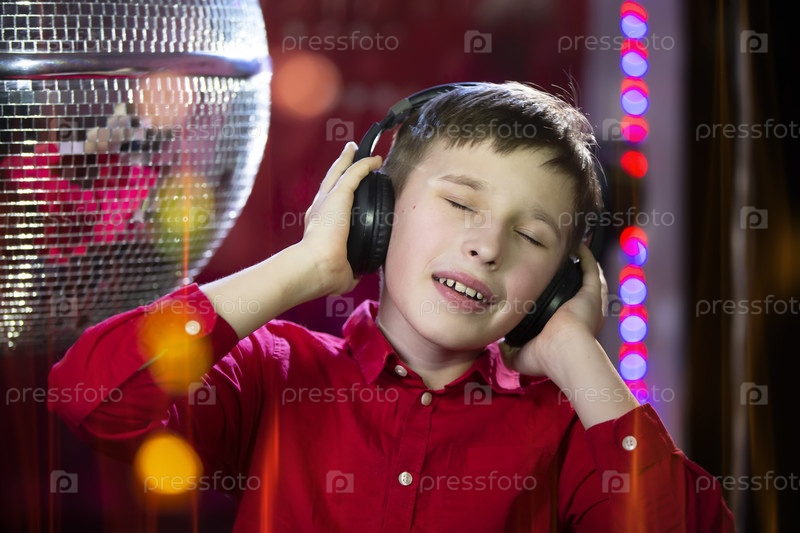 Ребенок в наушниках слушает музыку на фоне диско-шара