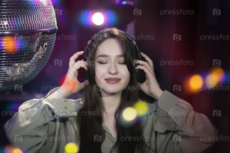 Красивая девушка в наушниках наслаждается музыкой на фоне световых лучей от диско-шара. Дискотека, вечеринка