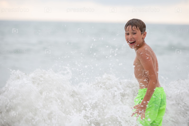 Счастливый мальчик купается в море, играет с волнами и брызгами
