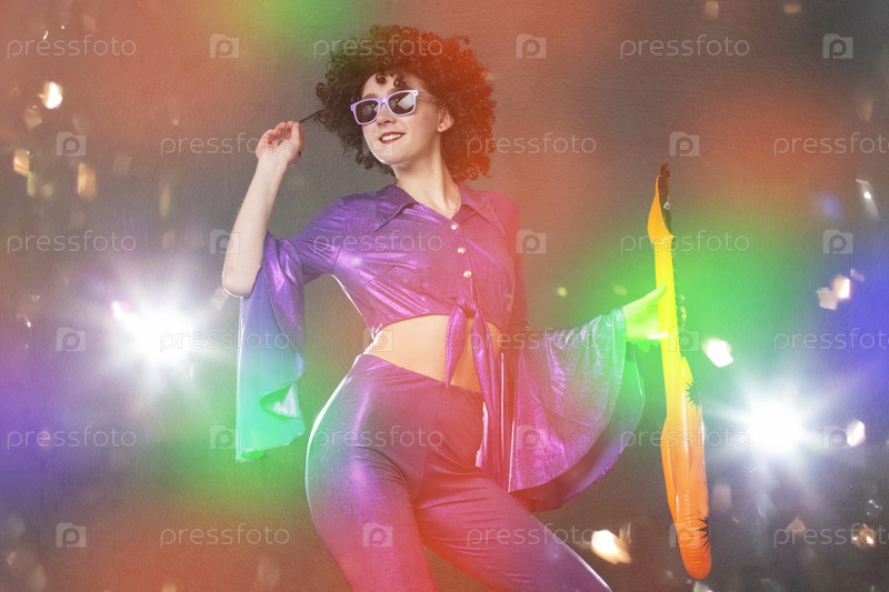 Счастливая девушка поп-певица с игрушечной гитарой на фоне блестящего конфетти. Стиль диско