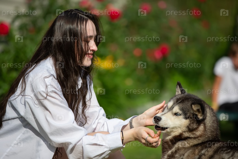 Красивая девочка играет с собакой породы хаски