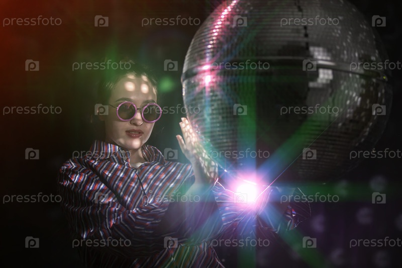 Красивая девушка в стильных очках вращает сверкающий диско-шар