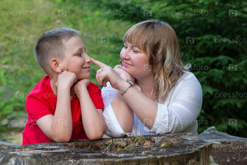 Счастливые мама и сын играют и общаются на летней прогулке