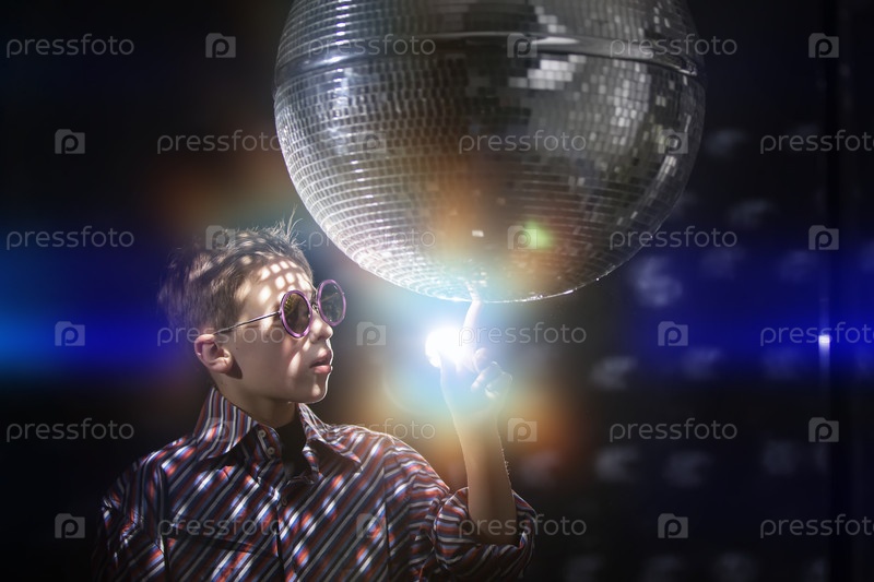 Молодой парень на вечеринке в лучах света и с диско-шаром