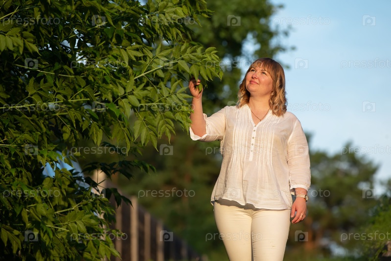 Красивая блондинка с пышными формами любуется красивым деревом