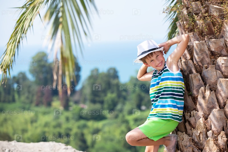 Счастливый мальчик в панаме стоит возле тропической пальмы, смотрит в камеру и улыбается. Ребенок на каникулах в тропической стране