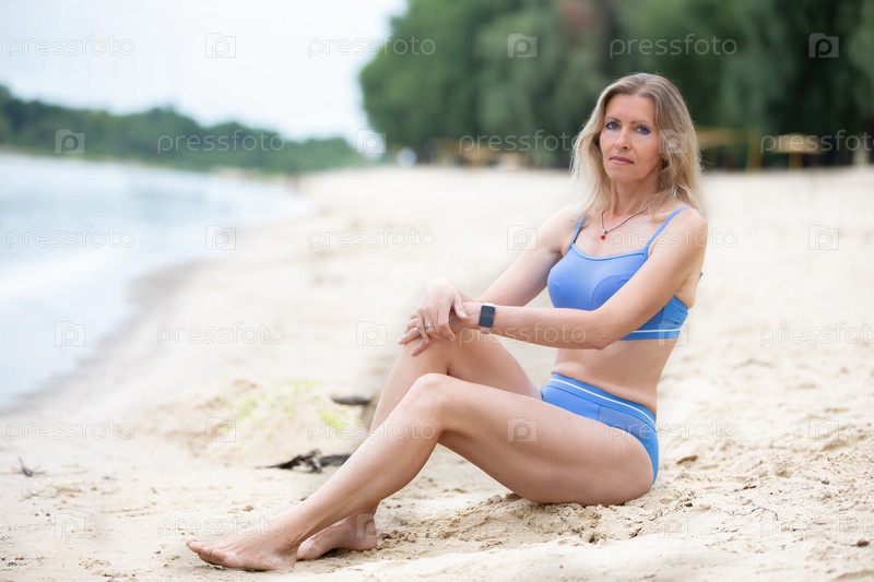 Красивая худая блондинка средних лет в купальнике сидит на пляже