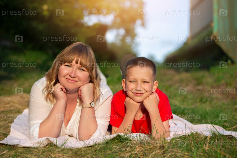Счастливая мама и сын на летней прогулке или пикнике улыбаются, проводят время вместе. Мать и сын